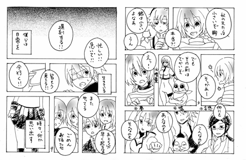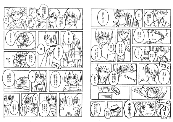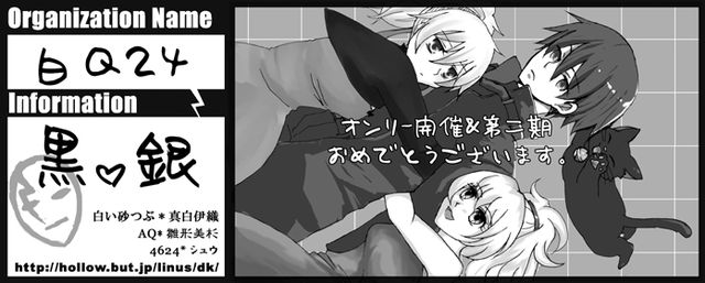 ![]() ●[(白Q24)]は、DTBオンリーイベントのために結束した合同サークル[白Q24]の情報サイトでした。 真白伊織・雛形美杉・シュウ各自の個人サークル名(白い砂つぶ、AQ、4624)をくっつけて生まれました。 ●参加したイベント* ![]() ●鈴屋商店-14 / 白Q24(シロクニジュウシ) / cut / ポスター ●当日イベントに参加した皆様、スペースを訪れてくださった方、本を手に取ってくださった方、本を購入してくださった方、 そして主催者様、本当にありがとうございました!DTBがだいすきです。またいつかどこかでお目にかかれたら幸いです。 ------------------------------------------------------------------------------------------------------------------------------ ![]() 【雛形美杉...AQ】(sold out) 「おやすみ」黒銀/A5/24P/¥300/smpl /100214発行*外伝1話くらいの黒と銀。南米アンバー、白も出てきます。寝かしつけループ。 「女子中学生日記。」/A5/12P/Copy/¥100/smpl /100214発行*紫苑の作った地球で、蘇芳と舞が仲良くなる話。 「糸」黒銀/A5/20P/Copy/¥100/smpl /071111発行*銀だけでなく、黒も糸(ワイヤー)を伸ばしていたんだよ、という話。と小ネタ2本。 【シュウ...4624】 「錆びた銀紙」 黒×銀 /B5/32P/¥500/smpl /100214発行*逃亡中〜2期ED後まで。かっこいい銀と情けない黒を目指しました。 「Fan-fare」オールキャラギャグ/A5/20P/Copy/¥200/smpl /100214発行*風邪引いた黒を皆がお見舞いに来る話。(sold out) 「ミルキーウェイ」2期黒組ギャグ/B6/14P/Copy/¥100/smpl /100214発行*蘇芳→黒で、猫と7がひどい。新しい地球も少し。(sold out) 「アステリア」黒+李/B5/20P/¥300/smpl /080706発行*黒と李が四畳半で二人暮らししてる頃の話。ながれぼし。 「deny-any」 黒+李/A5/16P/¥200/smpl /080706発行*最終回の黒と李のコピー本。もういない李。(sold out) 【無料配布したチロルチョコ】 ・雛形美杉 / 真白伊織 / シュウ ------------------------------------------------------------------------------------------------------------------------------ ●雛形美杉_AQ_